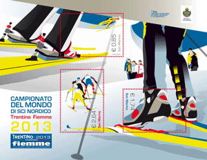 Il foglietto nuovo dedicato al Campionato del mondo di sci nordico 2013 Data emissione: 13 febbraio 2013 Valori: un foglietto con tre valori da € 0,85-1,74-2,64 Tiratura:70.000 foglietti Stampa: offset a quattro colori + giallo fluorescente a cura di Cartor Security Printing con inchiostro fluorescente come dispositivo di sicurezza Dentellatura: 13×13 ¼ Formato Foglietto: 185×143 mm Formato francobolli: 38,5×56 mm Autore bozzetto: Stefania Saragoni