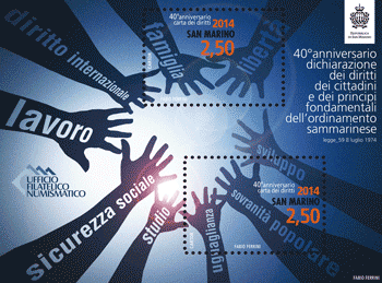 Foglietto contenente due francobolli da € 2.50 Formato del foglietto 153×113 mm Formato dei francobolli 56×38,5 mm Tiratura 50.000 foglietti Stampa offset in 4 colori (CMYK) a cura di Cartor Security Printing Inchiostro fluorescente colore giallo visibile con lampada UV ed invisibile a occhio nudo Autore bozzetto Fabio Ferrini