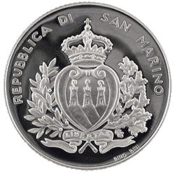 Emissione realizzata per la prima volta nella storia numismatica sammarinese, della moneta da 5 euro da 1 oncia in argento 999 versione brilliant uncirculated (BU).