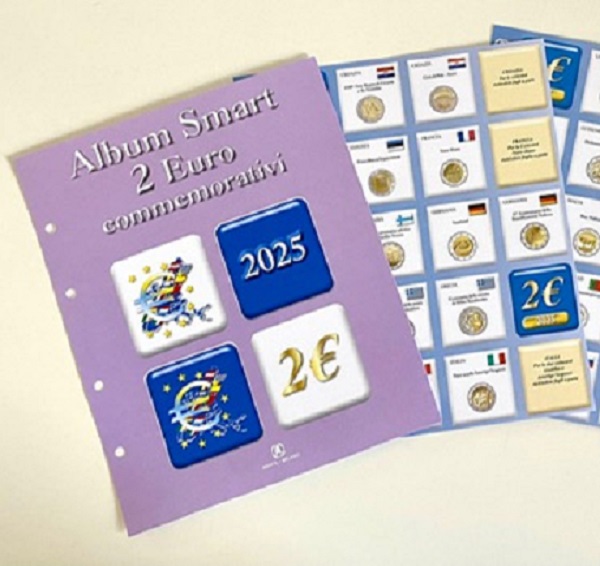 FOGLI PER 2 EURO COMMEMORATIVI CON DESCRIZIONE E RAFFIGURAZIONE DELLE MONETE E TASCHE CONTENITIVE DELLE MONETE USCITE