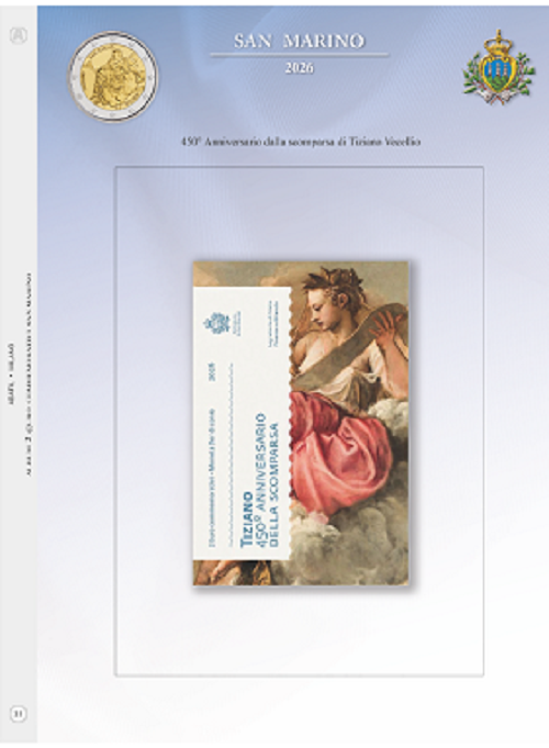 Foglio per 2 euro San Marino 2026 dedicato al 450° Ann. della scomparse di Tiziano (ABAFIL)